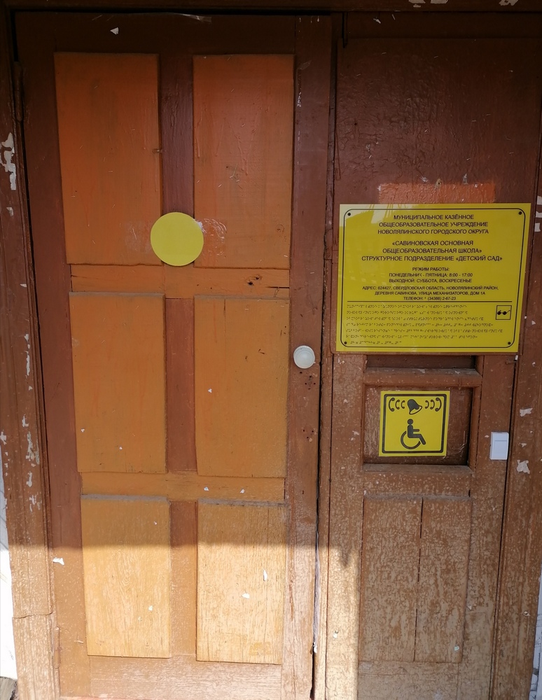 - У входной двери имеется табличка с информацией о школе, выполненная рельефно-точечным шрифтом Брайля на контрастном фоне;
